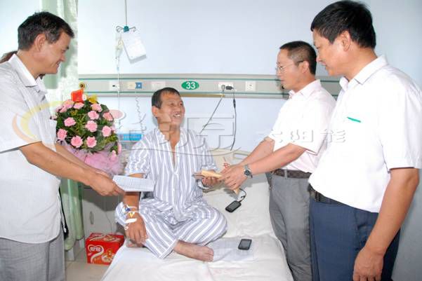倡议书随即引起了全体同事的高度关注,公司领导带头,广大员工踊跃参与,纷纷主动捐款,全体员工用点滴仁爱之心,向达师傅传递了一份生命的热度,谱写了光源人互助互爱的赞歌。8月15日上午公司领导买来花篮、水果和募集到的近2万元善款到医院看望病中的达师傅,并鼓励他用积极的心态战胜病魔,早日康复!