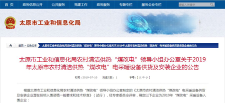 根据太原市工业和信息化局农村清洁供热“煤改电”领导小组办公室制定的《太原市农村清洁供热“煤改电”电采暖设备供货及安装企业潜在投标入围资格一般要求和技术标准》(试行),经专家委员会评审,确定河北光源太阳能科技有限公司为2019年山西太原市“煤改电”采暖设备入围企业。入围产品为:蓄热式电锅炉、蓄热式电暖器。