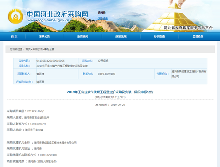 中标喜讯 | 喜报频传 再创佳绩 光源又获大标 | 2019年王官庄镇气代煤工程壁挂炉采购及安装