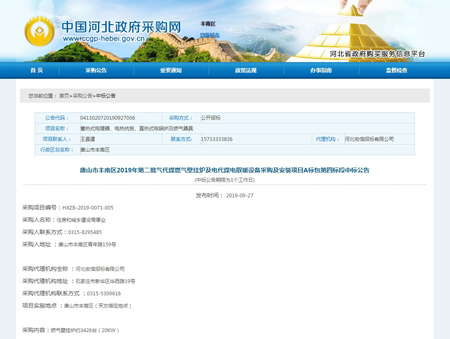 奋力拼搏创佳绩,捷报频传奏凯歌。河北光源太阳能科技有限公司,在2019年09月27日,唐山市丰南区2019年第二批气代煤燃气壁挂炉及电代煤电取暖设备采购及安装项目A标包第四标段中标,为我公司2019年度辉煌的经营业绩再添浓墨重彩的一笔。