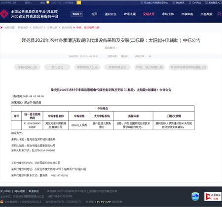 河北光源太阳能科技有限公司凭借完善细致的服务成功中标隆尧县2020年农村冬季清洁取暖电代煤设备采购及安装(二标段:太阳能+电辅助)。中标喜讯纷至沓来,彰显了本公司专业的施工实力与良好的市场口碑。 浩荡春风起,奋进脚步急。光源公司掀起“大干快上”的建设热情,以时不我待的精神,策马扬鞭,砥砺奋进。在这种特殊时期,市场再传捷报,无疑是对全体员工的鼓舞,有着非凡的意义。
