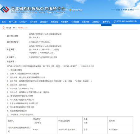 2020年,一场突如其来的疫情席卷全国,蔓延全球。隔离疫情不隔离服务,在此特殊时期,光源公司积极践行企业社会责任,保障复工复产的同时统筹疫情防控,严防死守全面做好疫情防控工作,科学有序复工复产。全体光源人振奋精神,团结协作,高效率、高质量投入复工后的公开投标项目,凭借三十余年行业经验和口口相传的业界优良口碑,以及雄厚的综合实力,持续为客户提供优质的产品和专业的售后服务。河北光源太阳能科技有限公司,中标临西县2020年农村地区冬季清洁取暖项目(电代煤)(第一标段:“太阳能+电辅助”)。