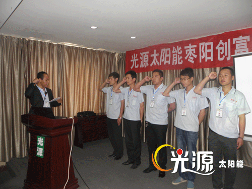 会议中湖北区域经理刘进辉带领团队进行的宣誓仪式,充分展现了光源太阳能有限公司的员工风貌及企业精神。利用新能源,保护美好家园,传承正能量,将会议推进高潮。