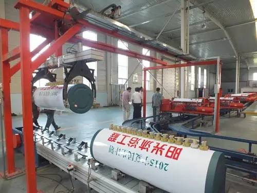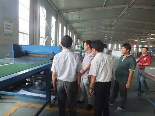 在参观完太阳能真空集热管制造车间后又到了太阳能工程设备总装车间,先后参观了全自动下料开平设备、转塔式全自动数控冲床生产线、全自动外皮双头缩口滚花机、卧式反向积放发泡生产线、环戊烷聚氨酯高压发泡机、全自动数控打包生产线以及壁挂太阳能生产线等等。