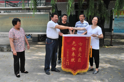 在村委会大院里,举行了简短的捐赠仪式。 王德英代表全村600多名受灾乡亲,从光源公司办公室主任刘琛手中接过5000元人民币,连连表示感谢,并向光源公司赠送锦旗一面,上写“心系灾区,无私奉献”。光源公司业务经理郭晖从王德英手中接过锦旗,握手合影留念。